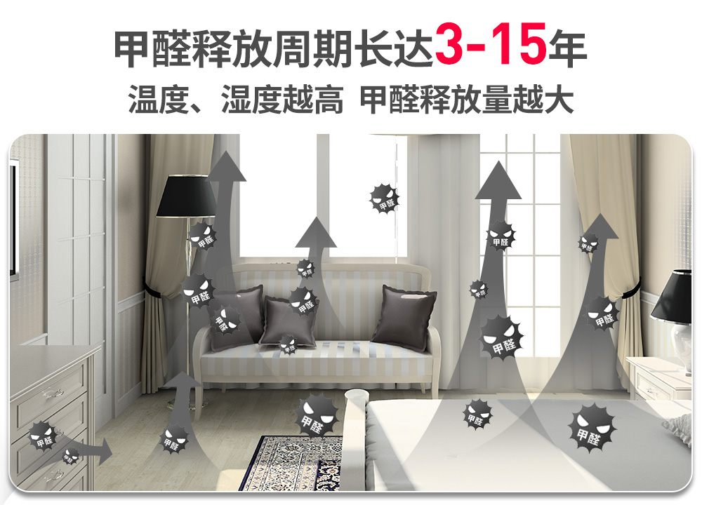 甲醛的一個(gè)特性,決定了治理它遠(yuǎn)不是簡單的小事一件,可以說,如果甲醛是個(gè)人的話,人們一說除甲醛,甲醛就笑了。各類除甲醛產(chǎn)品、各式的除甲醛方法、除甲醛妙招,在甲醛面前各有各的力不從心。這個(gè)特性就是:第一,污染源釋放甲醛的時(shí)間非常長,長達(dá)3~15年;第二,甲醛喜仗高溫、高濕之勢,就像山火借了夏風(fēng)的勢,一發(fā)不可收拾,新房在前幾年,每年都會反復(fù)多次籠罩在中重度超標(biāo)的甲醛之中。