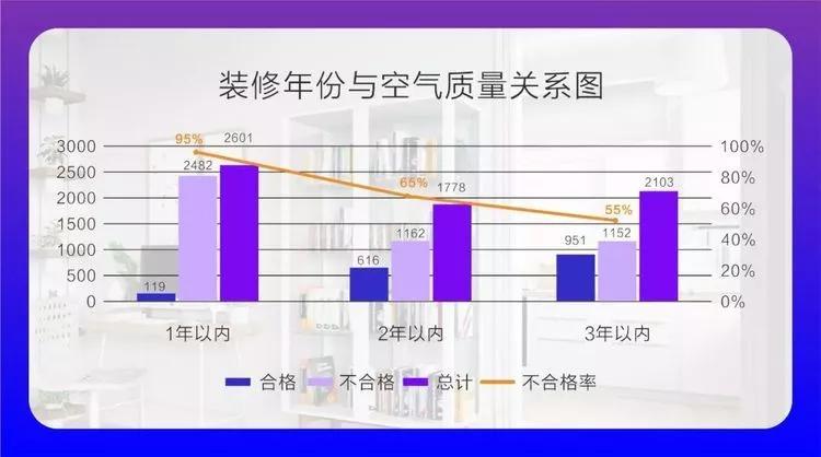 室內空氣污染程度隨著裝修完成年份的增長而降低,其中裝修1年內房屋不合格率為95%,裝修2年內不合格率為65%,裝修3年內不合格率為55%